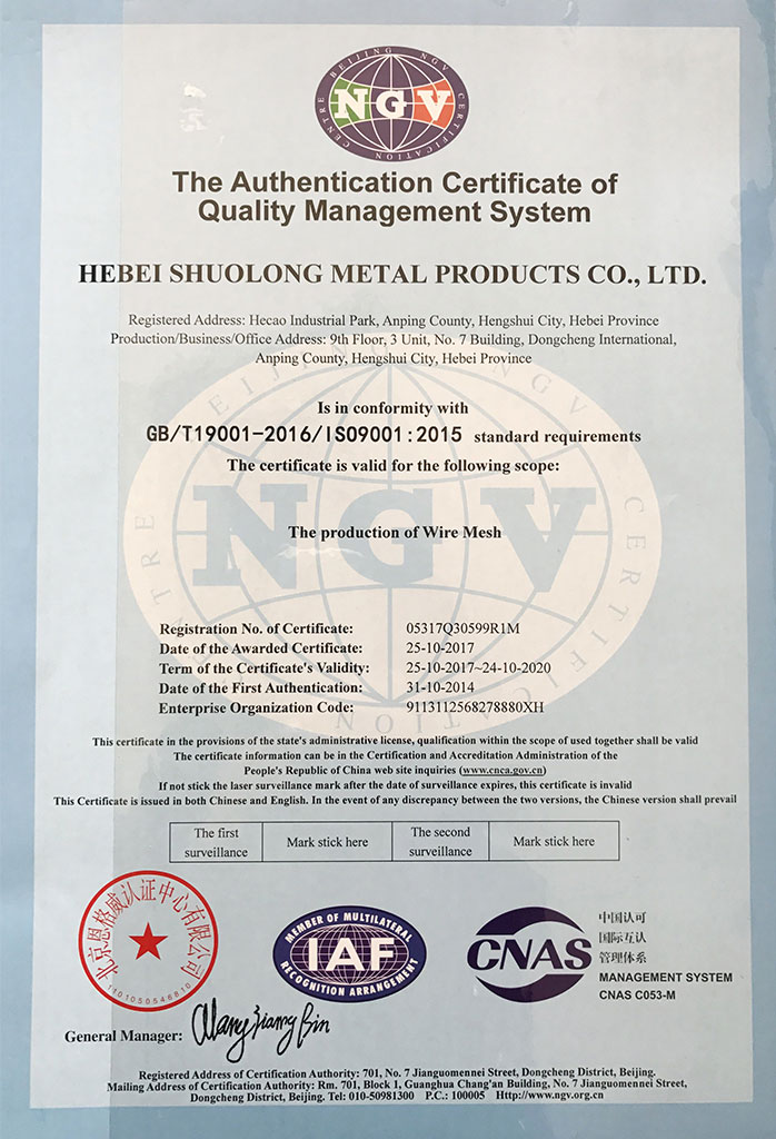 Hebei Shuolong Metal Products Co., Ltd является производителем металлической сетки, специально в тканной проволочной сетке, сетки из нержавеющей стали и архитектурной металлической сетки. Наша компания была основана в 2008 году, наша материнская компания является Anping Xiangyi проволочная сетка фабрика, которая была найдена в 1997 году. Он расположен в округе Анпин, городе Хэншуй, провинции Хэбэй, Китай. Он находится рядом с портом Тяньцзинь и городом Пекин, пользуясь водным, наземным и воздушным транспортом.=+Благодаря усилиям всего нашего персонала, мы стали крупным производителем проволочных сеток. Люди Shuolong постоянно пытались улучшить качество продукции и сделать продукцию примерно на 100% идеальной для мирового рынка.=+Мы экспортировали в Америку, Канаду, Сингапур, Италию, Катар, ОАЭ, Индию и другие 40 стран и регионов. Мы всегда пытались выходить на международный рынок. Мы рассматриваем «разумные цены, эффективное время производства и хорошее послепродажное обслуживание» в качестве нашей цели. Мы надеемся сотрудничать с большим количеством клиентов для содействия взаимному развитию и выгодам. Добро пожаловать, чтобы связаться с нами.