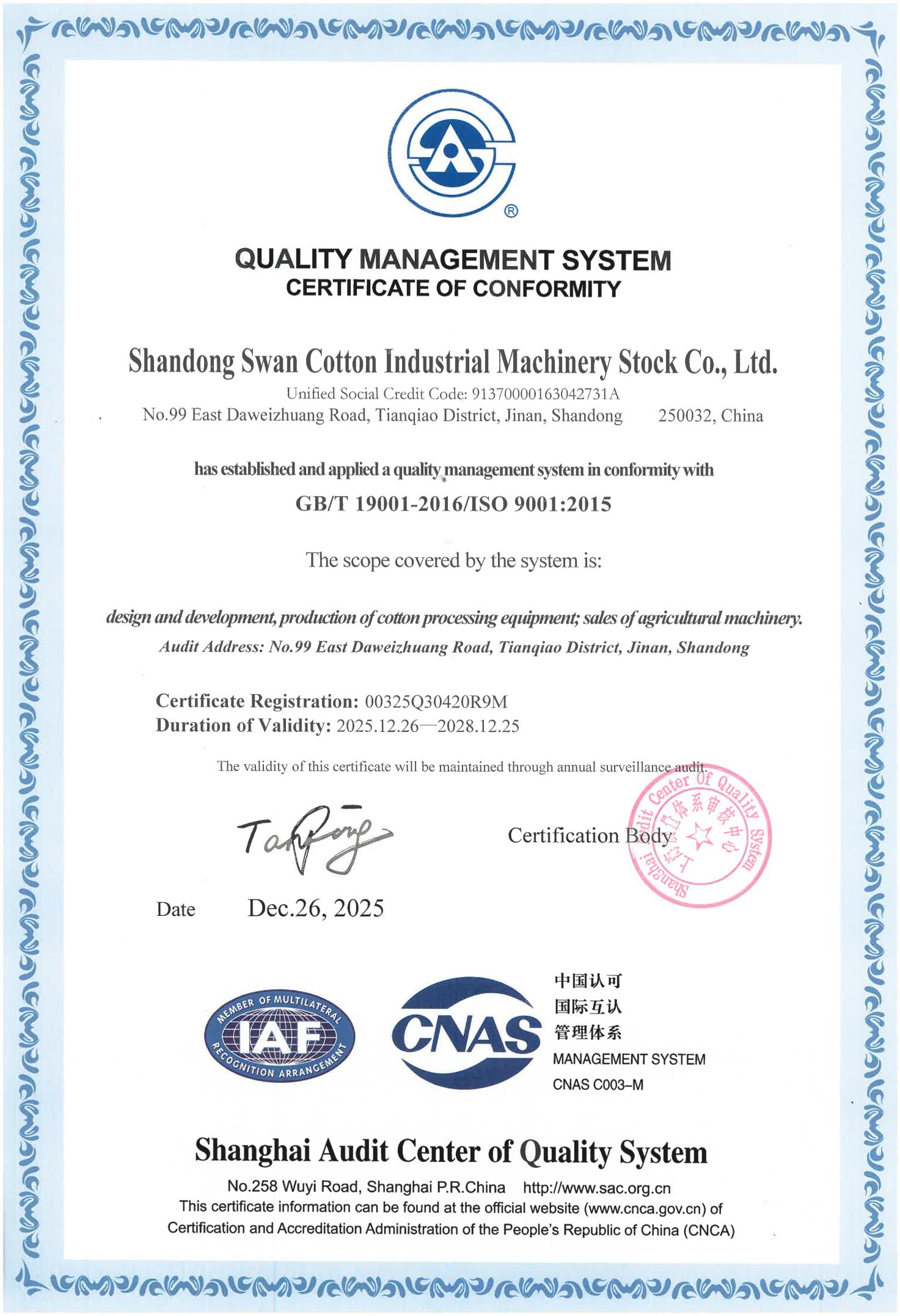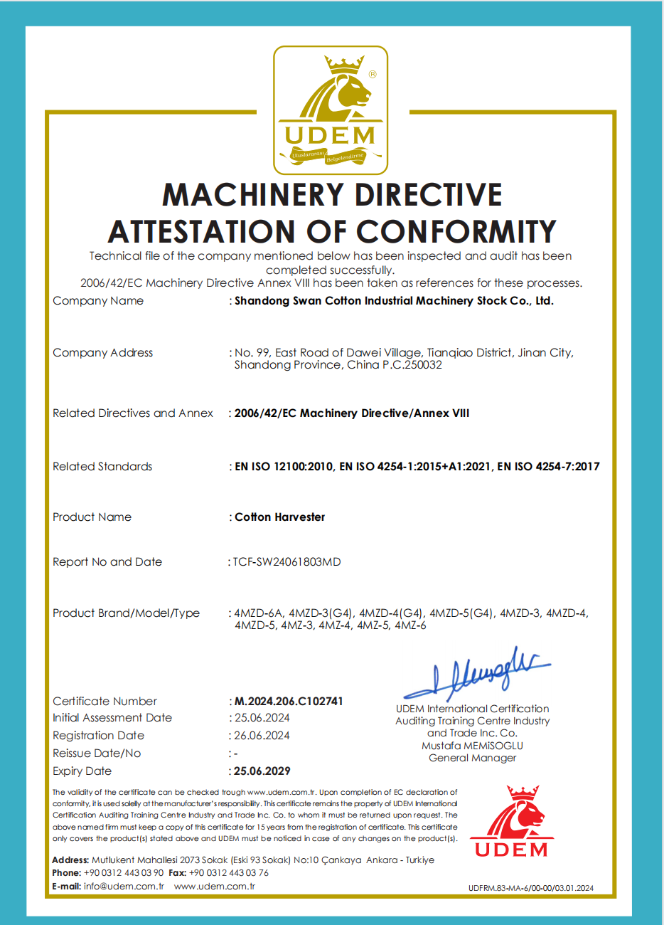 Shandong Swan Cotton Industrial Machinery Stock Co., Ltd. является котируемой компанией, принадлежащей Shandong Supply and Marketing Cooperatives. Его предшественник был основан в 1946 году. Он собирает научные исследования и разработки, точное производство, маркетинговое обслуживание и капитальную деятельность в целом, и специально обеспечивает единовременное поставку и обслуживание для механизированного, интеллектуального и информатизированного оборудования для переработки хлопка. Продукция экспортируется в более чем 30 стран. Доля внутреннего рынка занимает первое место в течение нескольких лет. Сеть маркетинговых услуг распространяется по всей основной мировой области производства хлопка.=+Основываясь на хлопковом оборудовании в качестве основного бизнеса, компания сосредоточена на содействии трансформации и модернизации хлопковой промышленности, создании новой эры умного завода, создании первого бренда хлопкового оборудования в мире, активном расширении интеллектуальной сельскохозяйственной машиностроительной промышленности оборудования и полном выходе в производственную промышленность высокого уровня оборудования.